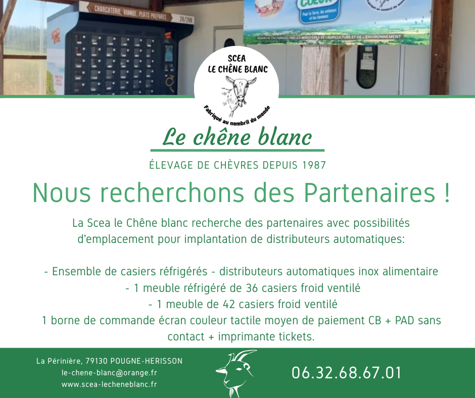 La SCEA Le Chêne Blanc met à votre disposition des casiers réfrigérés situés à Saint-Pardoux-Soutiers, à la station de lavage OKI. Faciles d’accès et sécurisés par un code, ils vous permettent de récupérer vos produits à tout moment, en toute autonomie. Vous y trouverez notamment des plateaux de fromages, des produits laitiers, du beurre, ainsi que des conserves de canard, de bœuf et bien d’autres spécialités. Grâce à ce système, l’ensemble de nos produits est disponible en Click & Collect.